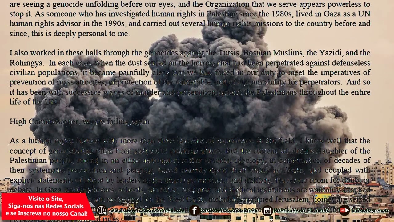 Craig Mokhiber está se aposentando do cargo de diretor do escritório do Alto Comissariado da ONU para os Direitos Humanos e escreve a seguinte carta ao seu chefe, Volker Turk.Nações Unidas28 de outubro de 2023Prezado Alto Comissário,Esta será a minha última comunicação oficial a você como Diretor do Escritório de Nova York do Alto Comissariado para os Direitos Humanos. Escrevo num momento de grande angústia para o mundo, inclusive para muitos de nossos colegas. Mais uma vez, estamos a assistir a um genocídio a desenrolar-se diante dos nossos olhos, e a Organização que servimos apela impotente para o impedir. Como alguém que investigou os direitos humanos na Palestina desde a década de 1980, viveu em Gaza como conselheiro de direitos humanos da ONU na década de 1990 e realizou várias missões humanas noturnas ao país antes e depois, isto é profundamente pessoal para mim. Também trabalhei nessas salas durante os genocídios contra os tutsis, os muçulmanos bósnios, os yazidis e os rohingyas. Em cada caso, quando a poeira baixou sobre os horrores perpetrados contra populações civis indefesas, tornou-se dolorosamente claro que havíamos falhado no nosso dever de cumprir os imperativos de prevenção de atrocidades em massa, de proteção dos vulneráveis e de responsabilização. para os perpetradores. E assim tem sido com sucessivas ondas de assassinatos e perseguições contra os palestinos ao longo de toda a vida da ONU. Alto Comissário, estamos novamente a falhar. Como advogado de direitos humanos com mais de três décadas de experiência na área, sei bem que o conceito de genocídio tem sido frequentemente sujeito a abusos políticos. Mas o atual massacre em massa do povo palestiniano, enraizado numa ideologia colonial etno-nacionalista dos colonos, na continuação de décadas de perseguição e purga sistemáticas, baseada inteiramente no seu estatuto de árabes, e juntamente com declarações explícitas de intenções por parte dos líderes do governo e militares israelitas, não deixa espaço para dúvidas ou debate. Em Gaza, casas de civis, escolas, igrejas, mesquitas e instituições médicas são atacadas desenfreadamente enquanto milhares de civis são massacrados. Na Cisjordânia, incluindo Jerusalém ocupada, as casas são confiscadas e reatribuídas inteiramente com base na raça, e violentos pogroms de colonos são acompanhados por unidades militares israelitas. Em todo o país, governa o Apartheid. Este é um caso clássico de genocídio. O projecto colonial europeu, etno-nacionalista, de colonização na Palestina entrou na sua fase final, rumo à destruição acelerada dos últimos remanescentes da vida indígena palestina na Palestina. Além do mais, os governos dos Estados Unidos, do Reino Unido e de grande parte da Europa são totalmente cúmplices deste terrível ataque. Não só estes governos se recusam a cumprir as suas obrigações do tratado de garantir o respeito pelas Convenções de Genebra, mas estão de fato a armar ativamente o ataque, a fornecer apoio econômico e de inteligência, e a dar cobertura política e diplomática às atrocidades de Israel. Volker Turk, Alto Comissário para os Direitos HumanosPalácio Wilson, Genebra